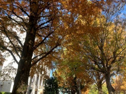 前回ご紹介したメタセコイア。街路樹ならぬ、キャンパス路樹のメタセコイアは、学内でも一際存在感を持っています。黄色に、橙色に、秋の装いが美しい!大学生女子たちはここで映えな写真を撮っています(笑)