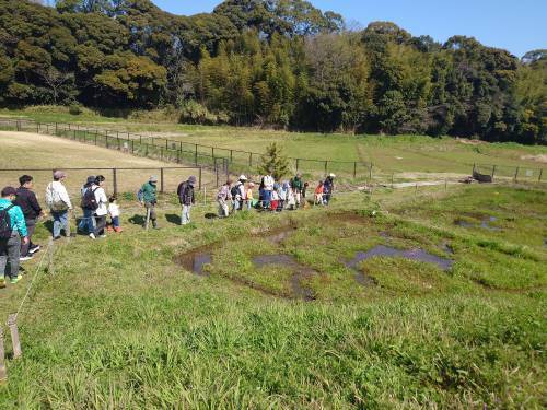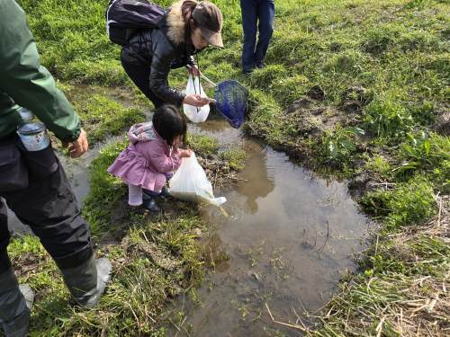 今回は30名の方々にご参加いただき、園内の田んぼでアカガエルの卵を救出したり、湿地でオタマジャクシを観察したり、顕微鏡で野草を見たりと、春の里山を満喫できる観察会となりました。