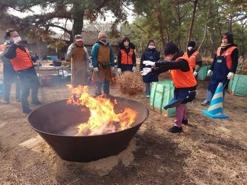 松葉をかいて体を温め、炭化器の炎で暖をとりながら、松原の保全活動に取組みました。