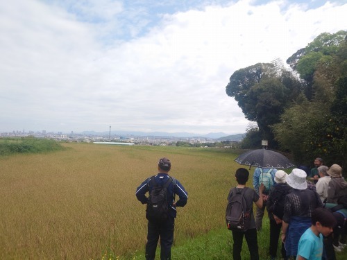 大ヤマモモを目指して歩く予定でしたが、早朝までの雨で林道が滑りやすかったため、コースを変更。里公園周辺の田園や古墳を巡る「里山まんきつコース」を歩きました。