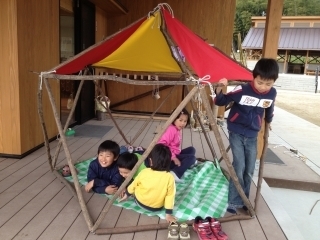 午後は、森の手入れで伐った木の枝を使った「森んこテント」づくり。