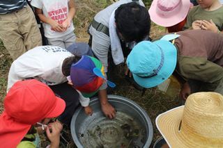 まだ梅雨明けしていないとは思えない陽射しの中、総勢約30名の満員御礼で、園内の草地や田んぼ脇のビオトープでの生きもの探し!