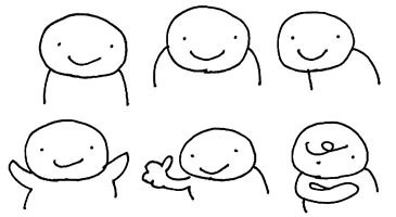 頭ができたらそこから2本,線を下ろすことで肩や体を表現することができます。左上がノーマルな状態だとしたら,少し上から線を下ろすと猫背or肩を落とした雰囲気に。また右上のように,左右でバランスを変えても動きが出て面白いです。下の段のように手を出したり,グッドサインや腕組みなども使えそうですね。