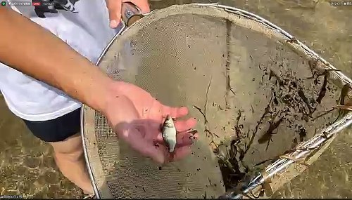 狙いの魚はなかなか入らず、「ドジョウはどんぐりを見せないと出てこないのかな?」と参加者からかわいらしいチャットをいただいていると、亀井さんの歓喜の叫び声が!