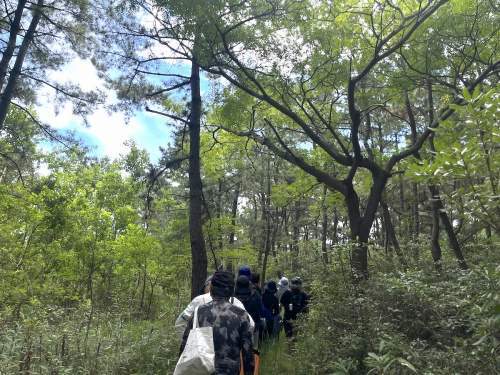 歩きながらクズの花の蜜をなめてみたり、顕微鏡で小さな花を覗いたりしながら「まぼろしの池」を目指します。