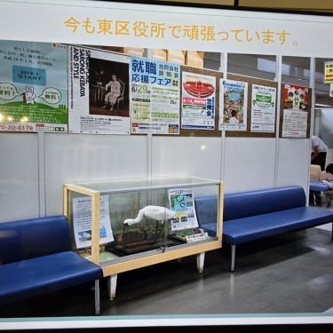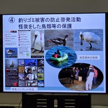 また、研究会が調査だけでなく清掃も活動に取り入れるきっかけとなった写真も紹介されました。多々良川で撮影された「くちばしが折れた若いクロツラヘラサギ」。とてもショッキングでした。エサを採る際、何か大きなゴミにひっかかってしまったのではないかといわれています。その後の清掃で川から自転車が数台、タイヤなどがあがったそうです。この個体は剥製になり、今も東区役所で頑張っています。