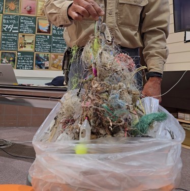 水辺の野鳥達を傷つけている釣りゴミについても、実物を持って来て詳しく教えてくださいました。糸が足に絡まったり、疑似餌をエサと誤って飲み込もうとしてしまったり。運よく人が捕まえてほどいてあげられる場合もあるそうですが、ほとんどは衰弱して死んでしまうそうです…。