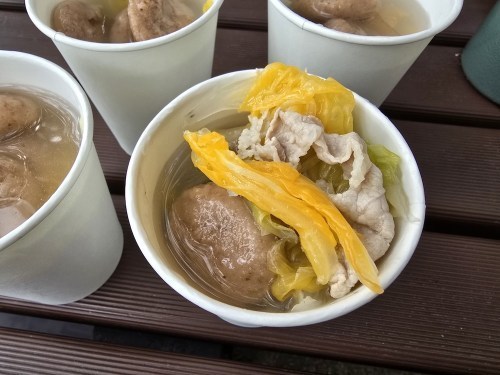 どんぐり粉50%のお団子、鮮やかな黄色の白菜、豚肉のショウガを効かせた中華風スープです。