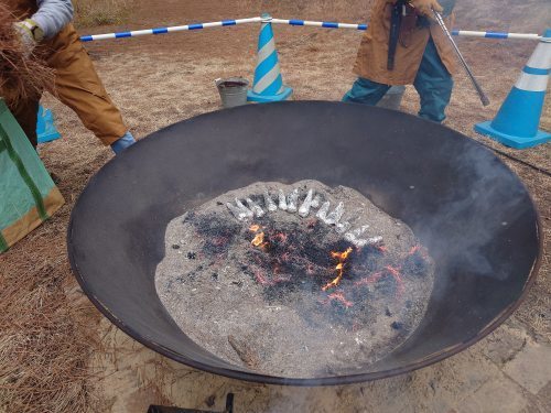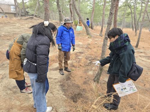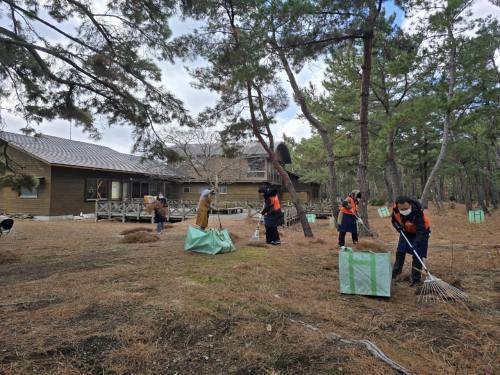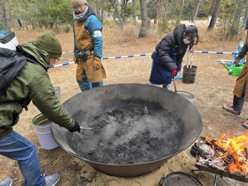 松葉をかいて体を温め、炭化器の炎で暖をとりながら、松原の保全活動に取組みました。