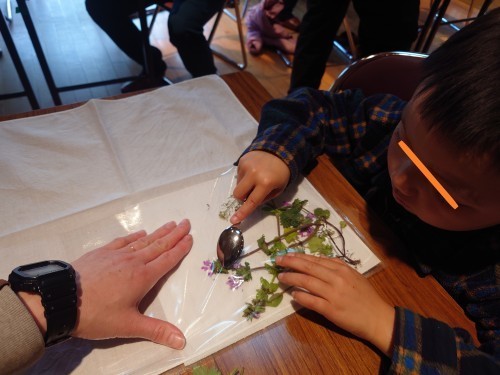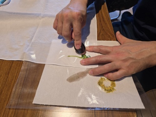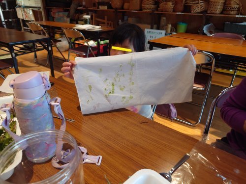 そして最後は、里公園に生えている植物で「こすり染め」。白いハンカチに、今日見つけた草花の思い出を残してもらいましたよ!