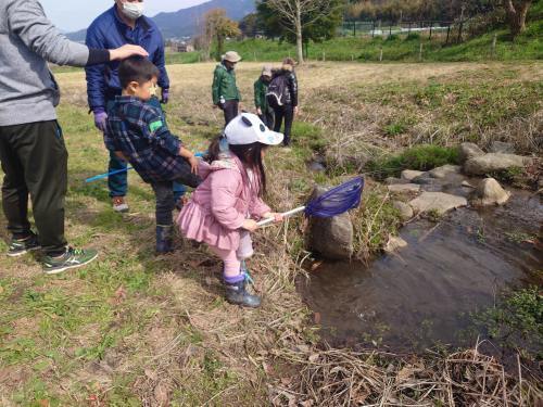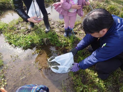 春の気配が漂い始めた里公園を散策しながら、アカガエルの卵を救出したり、湿地や畑、園内を流れるせせらぎで生きもの探しをしました。